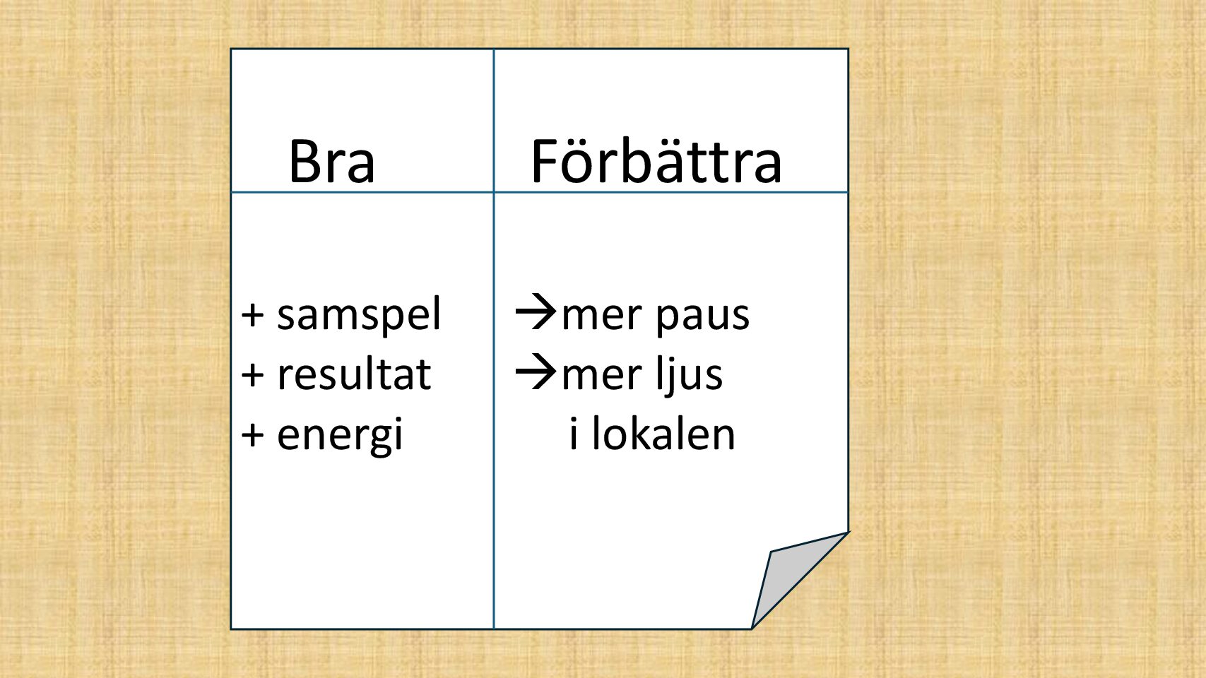 Förbered öppen dokumentation med kolumnerna Bra och Förbättra
