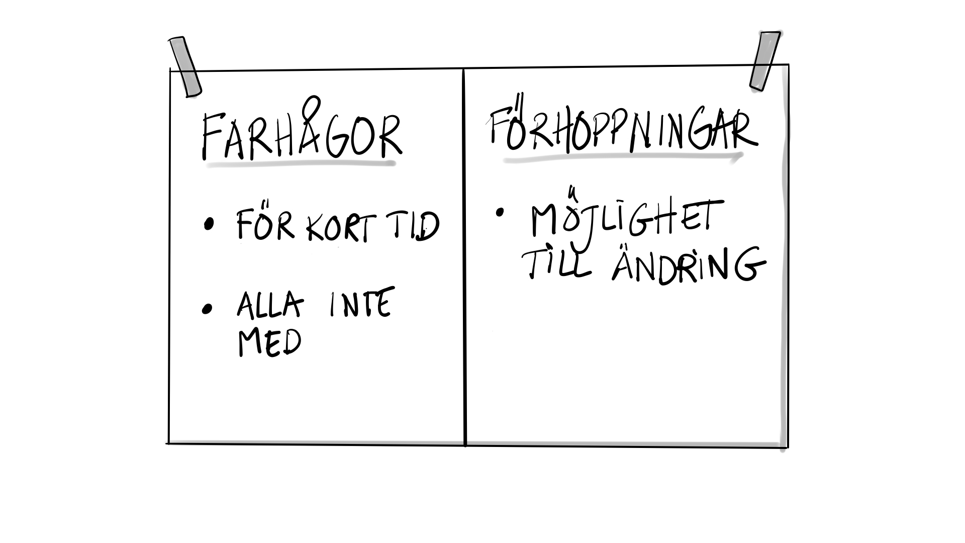 - Be deltagarna börja reflektera enskilt och skriva ner: farhågor, förhoppningar. En sak per lapp.
