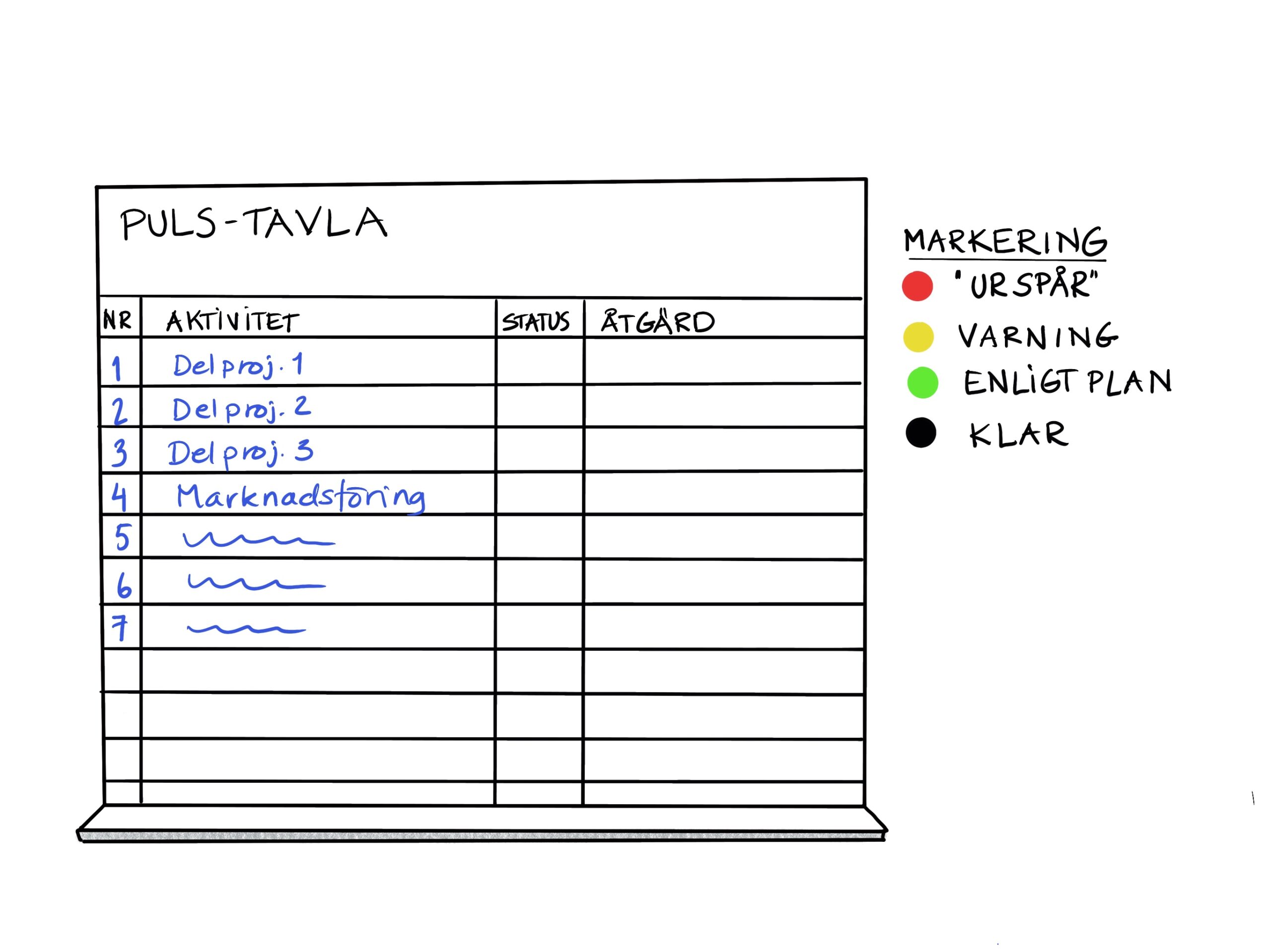 - Rita upp eller skapa tavlan med rader för det som ska följas upp, en tydlig plats för färgmarkering (rött, gult, grön, svart) och eventuellt en kolumn för kort kommentar eller åtgärd