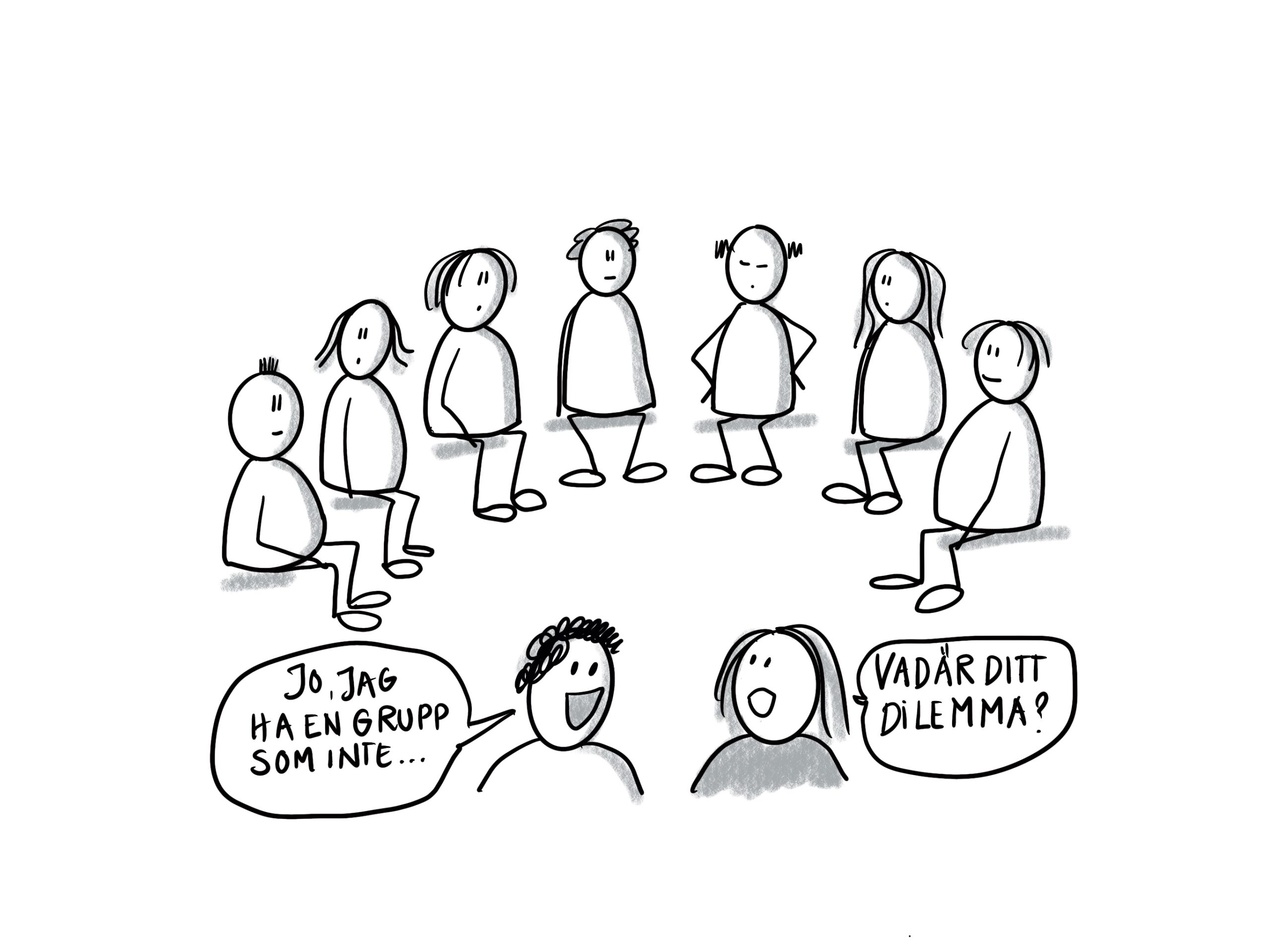 - Mötesledaren ber frågeägaren att vända sig med ryggen mot gruppen och ber gruppen reflektera fritt kring dilemmat exempelvis 10 minuter.