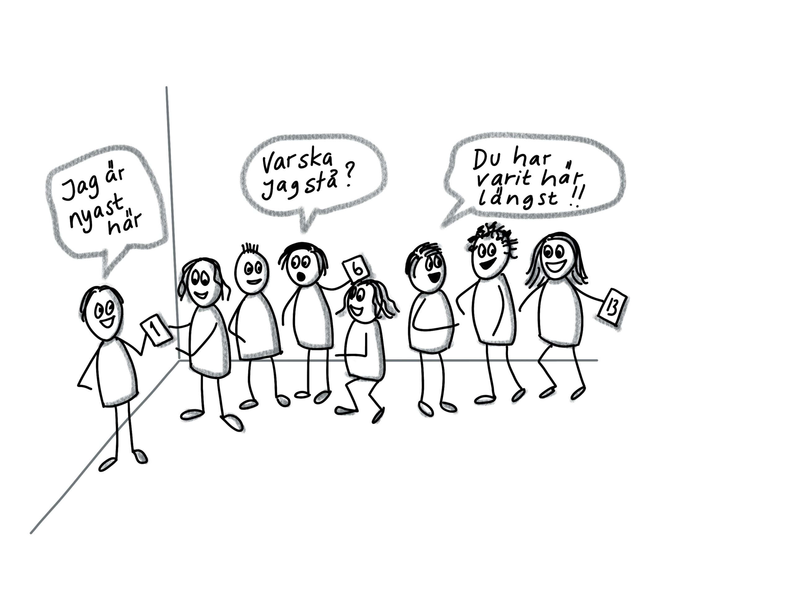 - Be deltagarna ställa sig på rad utifrån ett kriterium, t.ex.: Tid på dygnet de är födda, Hur länge de varit i organisationen, Avstånd hemifrån till jobbet.