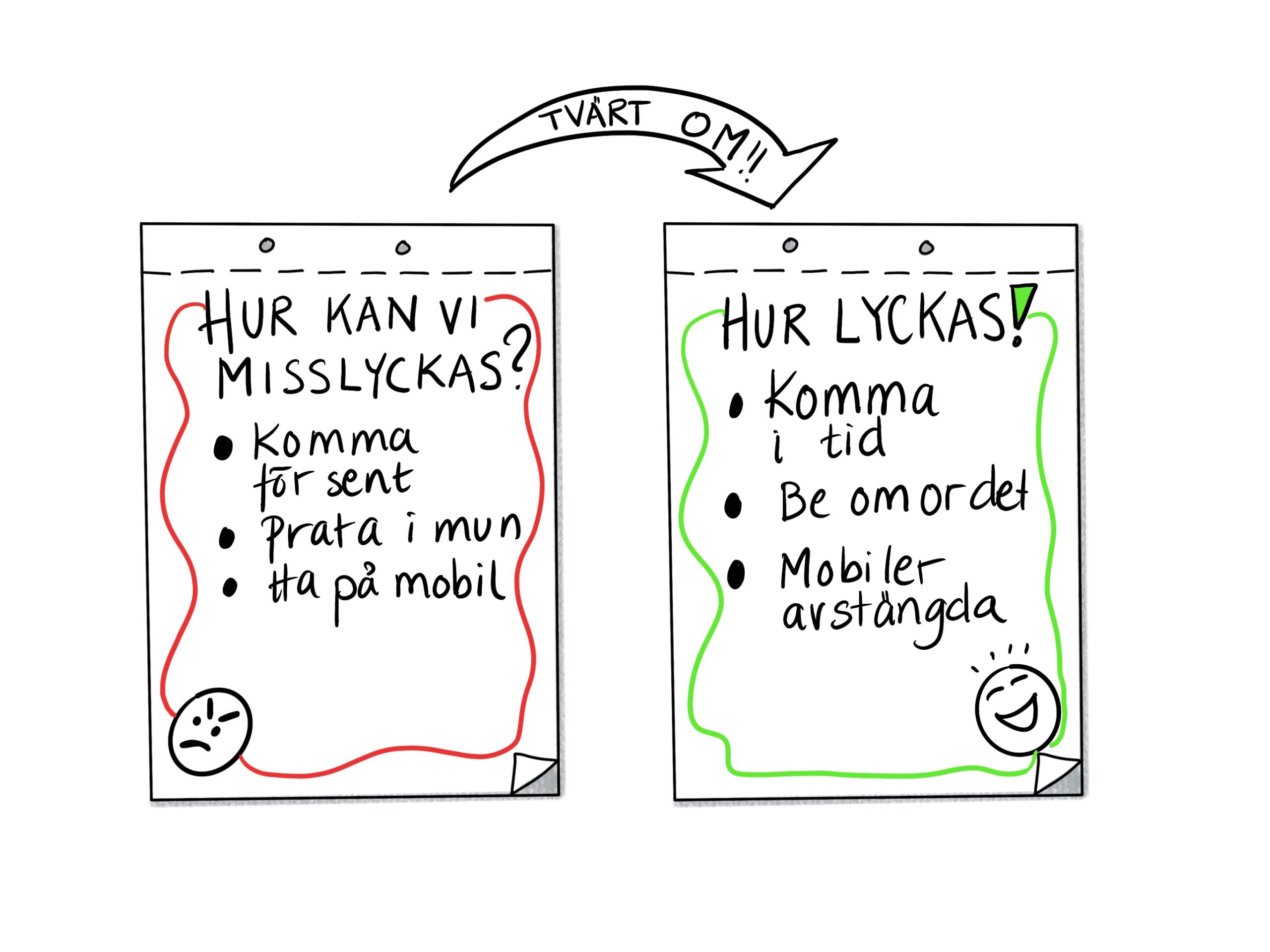 - Berätta att ni nu ska vara kreativa och tillsammans hitta hur ni verkligen kan misslyckas. Alla förslag är tillåtna!